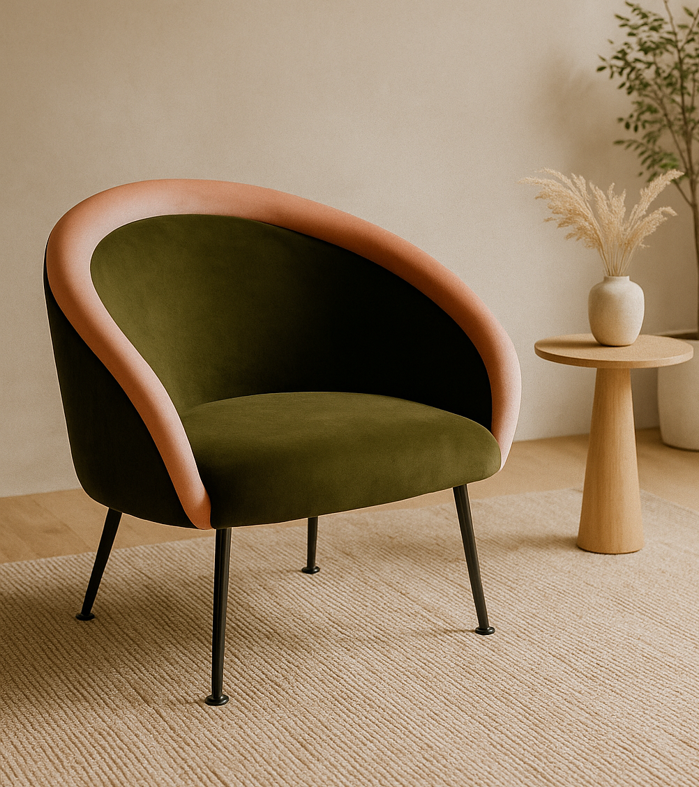 Ten odcień to hit sezonu! Oliwkowy fotel z miękkiego weluru świetnie wygląda solo, w kącie czytelniczym, lub jako dopełnienie beżowo-brązowej aranżacji.
