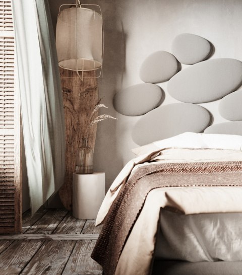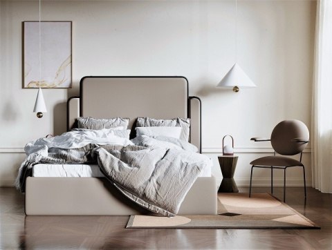 Sypialnia: łóżko tapicerowane w karmelowej tkaninie to przepis na ciepły, kojący klimat.