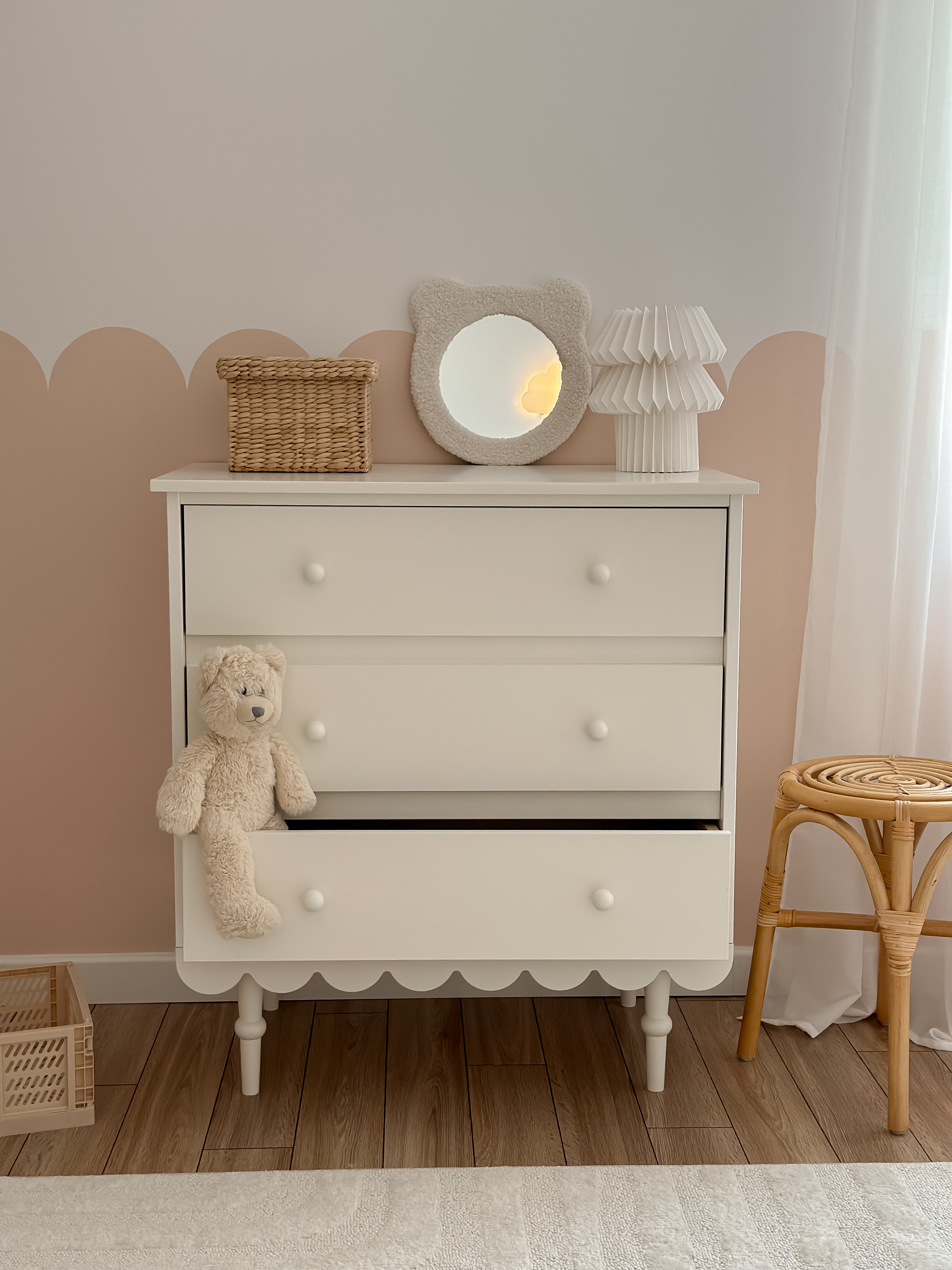 Codzienna pielęgnacja stanie się znacznie łatwiejsza dzięki wygodnej komodzie z szufladami. Komoda Babushka oferuje dużo miejsca do przechowywania ubranek, pieluch i kosmetyków, a jej piękny design z falbanką dodaje uroku każdemu wnętrzu.